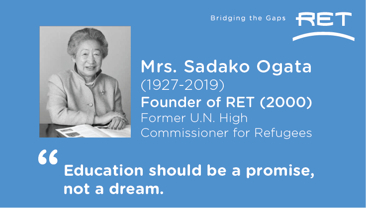 For all who met Sadako Ogata, be it for an hour, a day, or a lifetime, she taught us how to live well through her example. On behalf of all of us at RET, I extend our genuine sympathies to her family during this period of distress. Sadako Ogata’s presence will always be missed among us. Those of us who have been fortunate enough to know and work with Mrs. Ogata have lost an inspiring mentor. We promise her legacy will continue through the support RET offers to vulnerable young people around the world.
