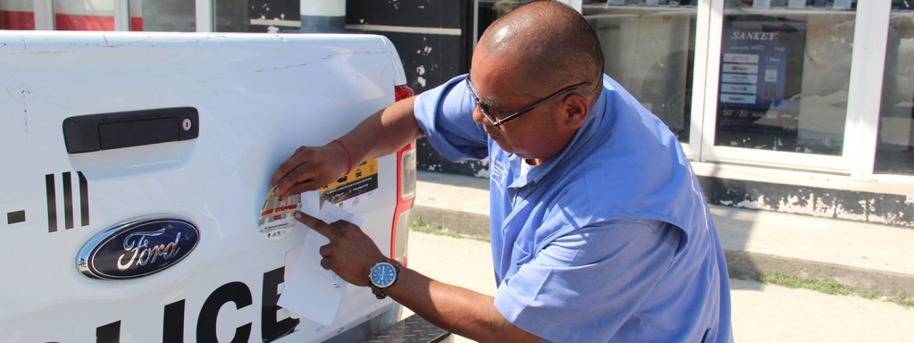 Photos (in order): 1) In Belmopan, the RET team and CSO Coalition members were joined by the Chief Transport Officer, Lean Gentle for distribution in the capital city (Photo by RET), 2) Poster distribution at Water Taxi Location in Belize (Photo by RET), 3) SAFE Belize project officer, Hector Sabido sharing anti-human trafficking bumper stickers local police (Photo by RET)